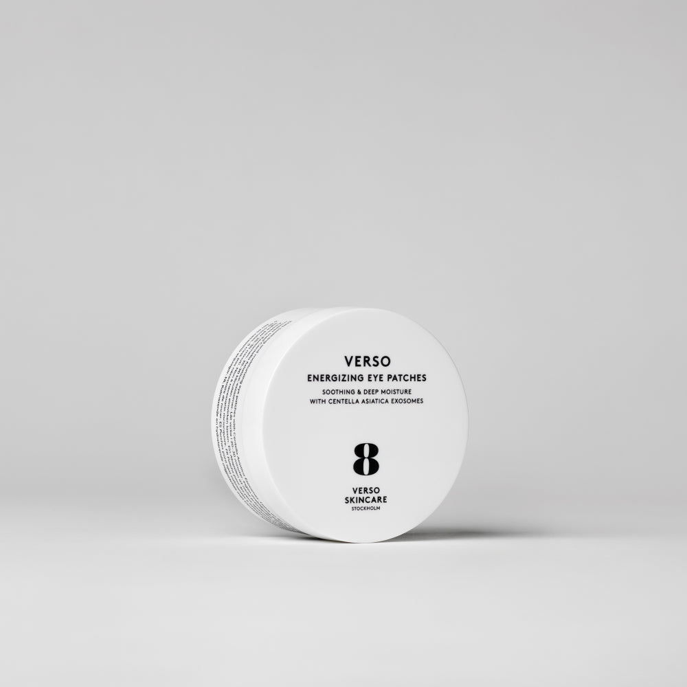 Give your eyes some love with Verso Energizing Eye Patches, a hydrogel power duo that instantly refreshes and plumps your under-eye area. Infused with Centella Asiatica exosomes, betaine, and mineral-rich seaweed (Fucus Vesiculosus), these patches help lock in moisture, reduce puffiness and dark circles, and strengthen your skin barrier. Thanks to the cooling hydrogel technology, you'll experience an instant refreshed sensation while the ingredients work their magic, leaving your face looking more awake and feeling smoother, more radiant, and more energized. Perfect for daily use or whenever your look needs a boost.