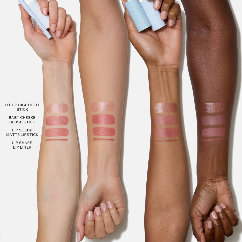 baby cheeks blush stick: caprylic/capric triglyceride / kaolin / caprylyl caprylate/caprate / simmondsia chinensis (jojoba) seed oil / polyethylene / mica / polyhydroxystearic acid / lecithin / behenylcarbamoylpropyl polysilsequioxane / tocopherol / ascorbyl palmitate / citric acid / rubus idaeus leaf cell culture / may contain/peut contenir (+/-): titanium dioxide (ci 77891) / iron oxides (ci 77491 / 77492 / 77499) / red 30 lake (ci 73360) / blue 1 lake (ci 42090) / red 7 lake (ci 15850) / yellow 5 lake (ci 19140) lit up highlight stick: diisostearyl malate / octyldodecanol / tridecyl trimellitate / synthetic wax / dimer dilinoleyl dimer dilinoleate / mica / glyceryl behenate/eicosadioate / synthetic beeswax / caprylic/capric triglyceride / vitis vinifera (grape) fruit extract / calcium sodium borosilicate / calcium aluminum borosilicate / dicalcium phosphate / silica / tin oxide / pentaerythrityl tetra-di-t-butyl hydroxyhydrocinnamate lip suede matte lipstick: isoamyl laurate / isodecyl neopentanoate / octyldodecanol / silica / synthetic wax / dicalcium phosphate / c10-18 triglycerides / helianthus annuus (sunflower) seed wax / kaolin / limnanthes alba (meadowfoam) seed oil / candelilla cera/euphorbia cerifera (candelilla) wax/cire de candelilla / synthetic beeswax / ethylhexyl palmitate / silica silylate / caprylic/capric triglyceride / polyhydroxystearic acid / tetrahexyldecyl ascorbate / tocopheryl acetate / disteardimonium hectorite / ethyl vanillin / tribehenin / isostearic acid / lecithin / pentaerythrityl tetra-di-t-butyl hydroxyhydrocinnamate / polyglyceryl-3 polyricinoleate / ricinus communis (castor) seed oil / sorbitan isostearate / hydrolyzed sodium hyaluronate / sodium hyaluronate / lactic acid / hydrogenated castor oil / palmitoyl tripeptide-1 lip shape lip liner - simmondsia chinensis (jojoba) seed oil / cera carnauba/copernicia cerifera (carnauba) wax/ cire de carnauba / dextrin isostearate / squalane / caprylic/capric triglyceride / dicalcium phosphate / candelilla cera/euphorbia cerifera (candelilla) wax / castor isostearate succinate / mica / hydrogenated castor oil / calcium silicate / tocopherol• Highlighter: Breng de Lit Up aan op de bovenkant van de wangen, jukbeenderen, cupidoboog en lippen voor extra stralend effect.